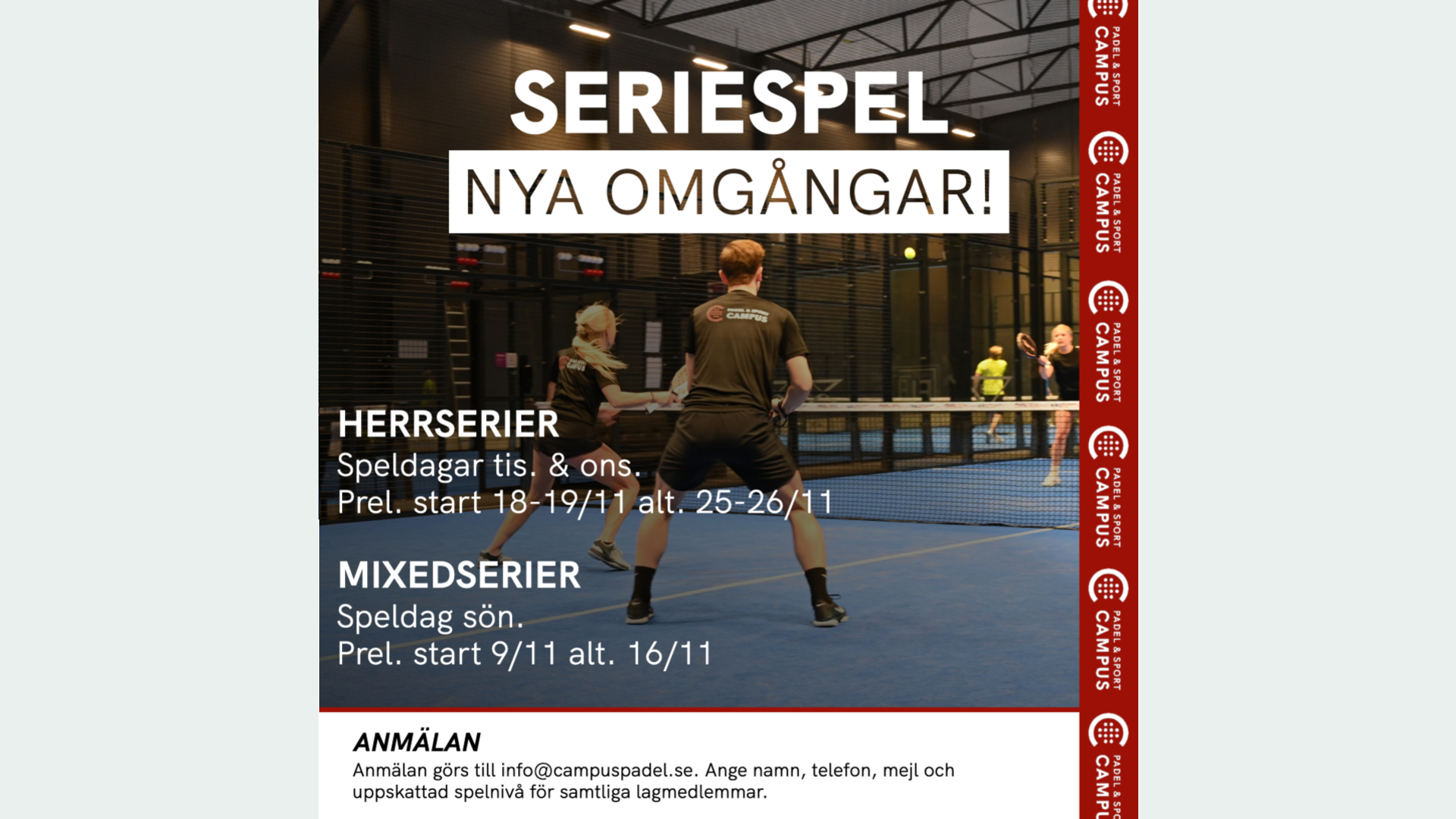 Om ditt lag vill gå med i seriespelet är ni varmt välkomna att göra en intresseanmälan till oss på info@campuspadel.se. Ange namn, telefonnummer, mejladress och uppskattad spelnivå för samtliga lagmedlemmar (två eller fler spelare per lag).